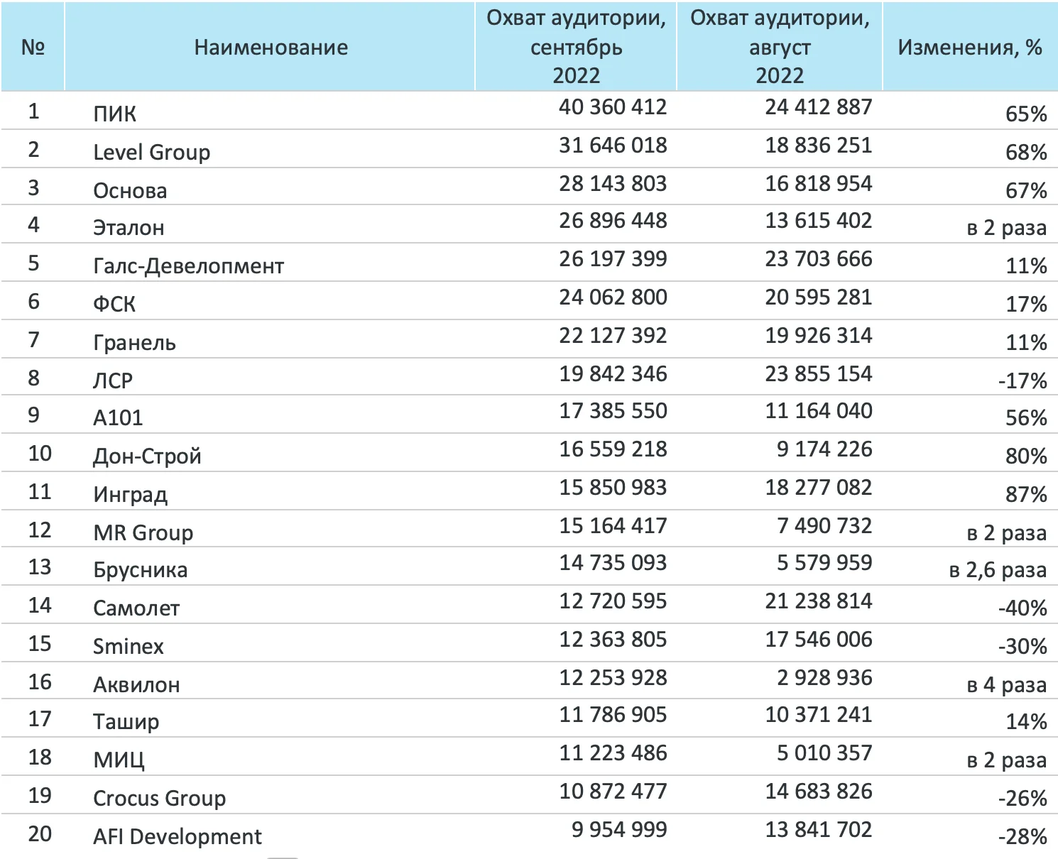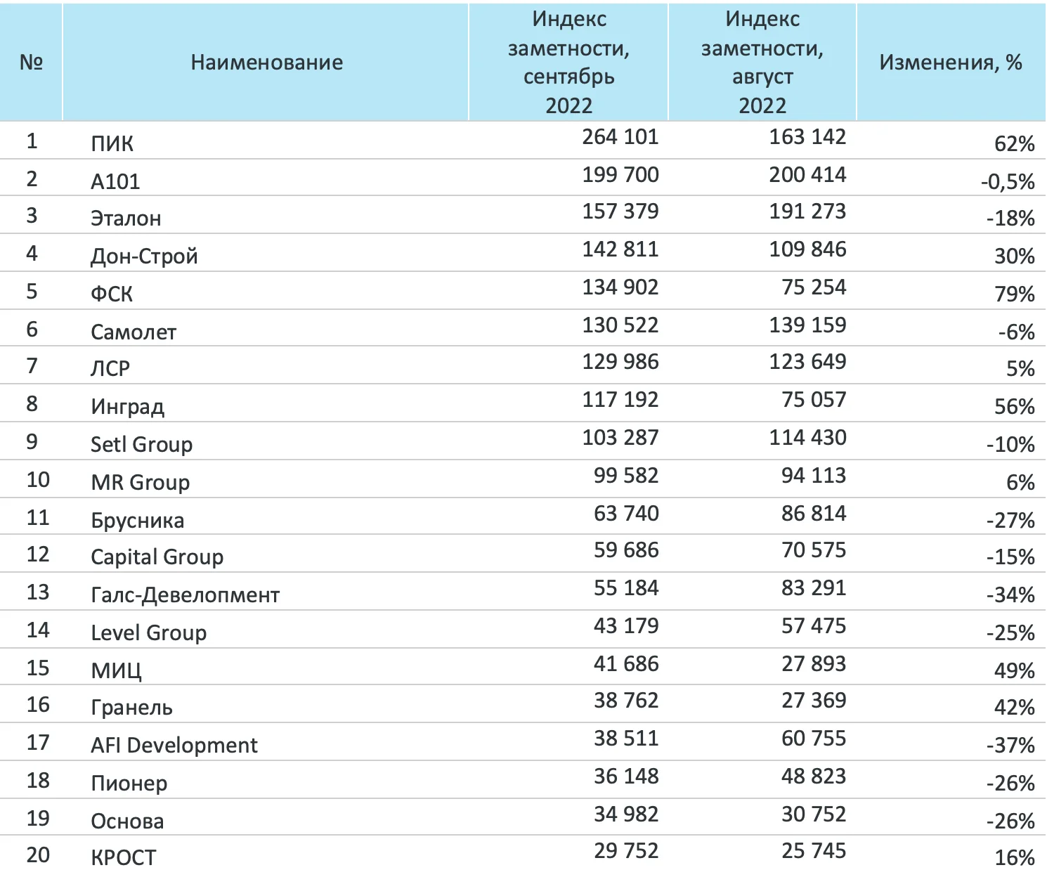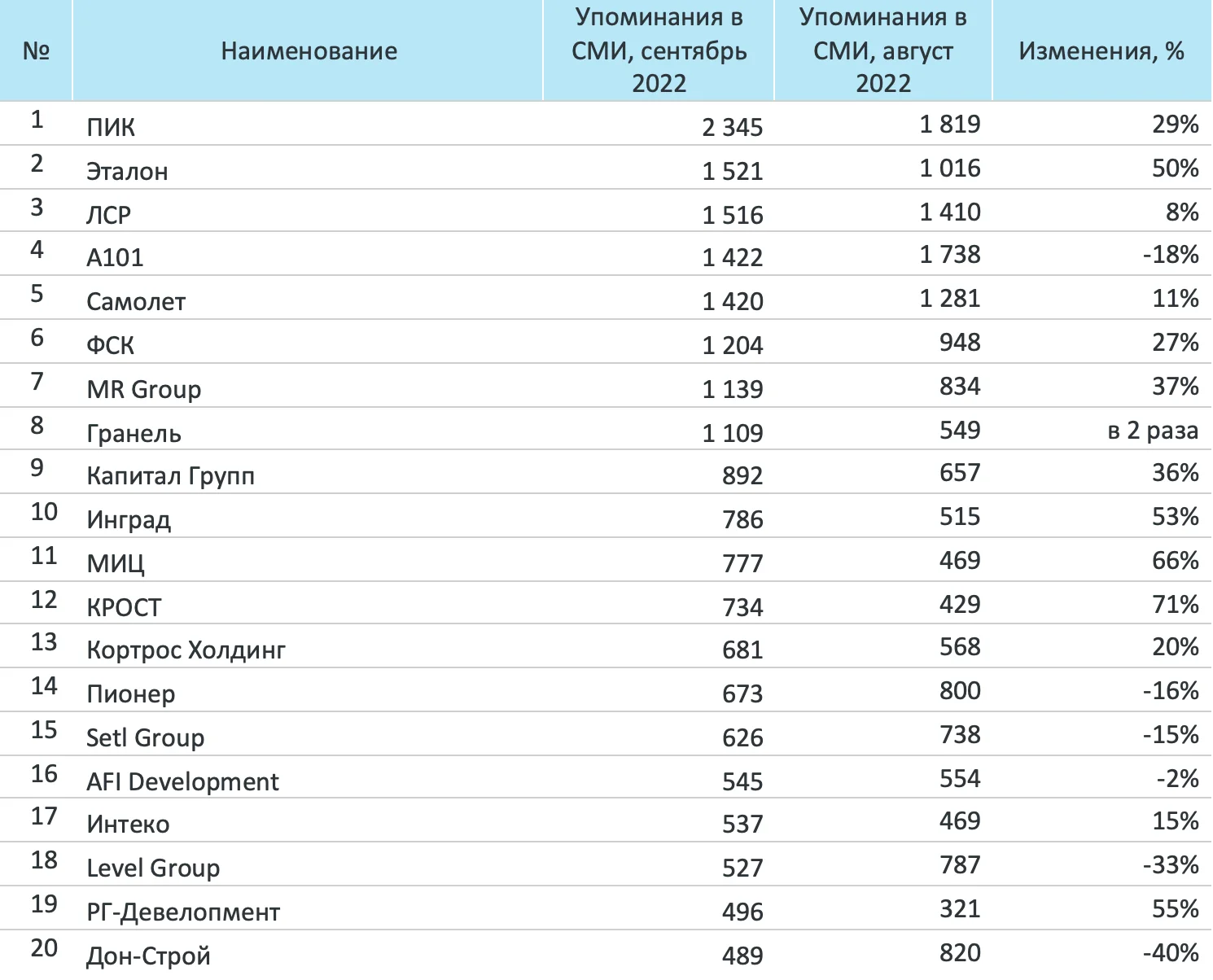Система мониторинга и анализа СМИ и соцмедиа СКАН-Интерфакс совместно со «Строительной газетой» подготовили медиарейтинг девелоперов за сентябрь 2022 года. ГК ПИК в сентябре 2022 г. вернулась на первые строчки трех медиарейтингов. Продолжают удерживать лидирующие позиции ГК «Эталон», ГК «А101» и «Группа ЛСР». Также в ТОП-3 попали компании Level Group и ГК «Основа», заняв второе и третье место по охвату аудитории соответственно.