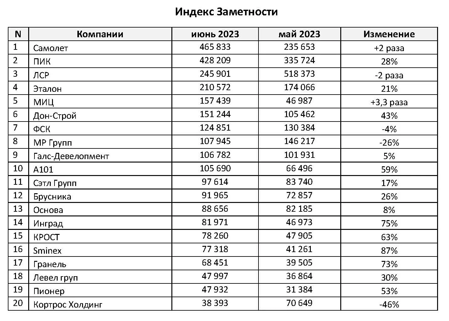«Группа ЛСР» заняла третье место по количеству упоминаний и Индексу заметности. Резонансным стало сообщение о том, что застройщик продал проект строительства жилья на Васильевском острове в Петербурге девелоперской компании Legenda. Основной владелец «Группы ЛСР» Андрей Молчанов продал сыну 10% акций девелопера, сократив свою долю в компании с 65,1% до 55,1%, что также тиражировалось в СМИ. Его сын Егор Молчанов, наоборот, увеличил долю в компании с 1% до 11% за счет приобретения акций. Другие новости июня 2023 г.: Девелопер выплатит акционерам дивиденды в сумме более 8 млрд руб.; продажи «Группы ЛСР» в Петербурге за первые четыре месяца 2023 г. упали в два раза по сравнению с аналогичным периодом 2022 г.; структура «Группы ЛСР» ООО «А плюс Естейт» пытается через суд оформить в собственность участок площадью 0,3 гектара на Зубовской улице в московском районе Хамовники, ответчиком по иску выступает госкомпания «Дом.РФ».