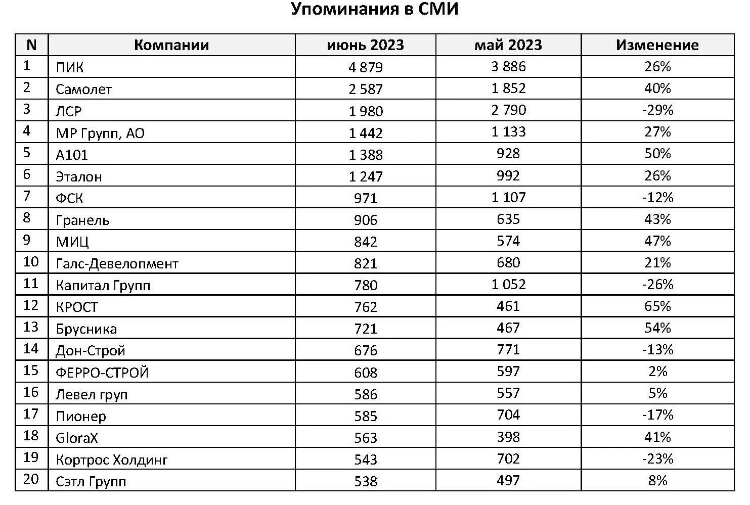 Система мониторинга и анализа СМИ и соцмедиа СКАН-Интерфакс совместно со «Строительной газетой» подготовили медиарейтинг компаний девелоперов за июнь 2023 года. В топе рейтинга сохранили свое присутствие ГК «ПИК», ГК «Самолет», «Группа ЛСР» и ГК МИЦ.
