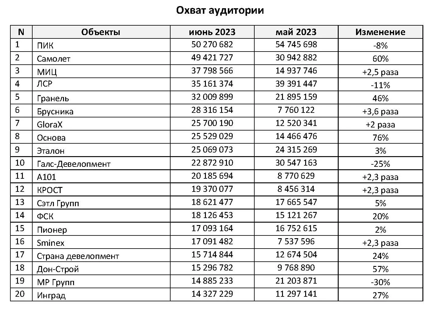 ГК МИЦ (третье место по аудиторному охвату) попала в ТОП-3 в связи с новостями о том, что весь бизнес группы будет продан девелоперу «Самолет». Сумма сделки, по данным ТАСС и «РИА Новости», – 40 млрд руб. К «Самолету» перейдут все проекты МИЦ, как строящиеся, так и перспективные, земельные участки, управляющие компании, сети и т.д. Девелопер МИЦ ввел в эксплуатацию ЖК «Вереск» на 957 квартир в районе Хорошево-Мневники.
