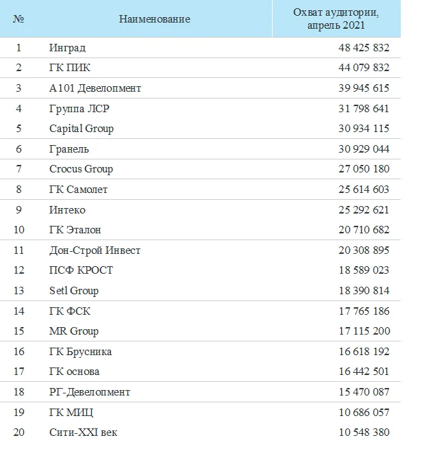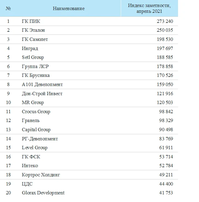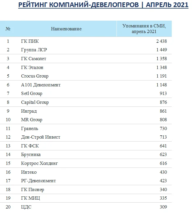 ГК «ПИК» в апреле 2021 года сохранила за собой лидирующие позиции медиарейтингах количеству упоминаний, однако спустилась на второе место по охвату аудитории, уступив лидерство ГК «Инград».