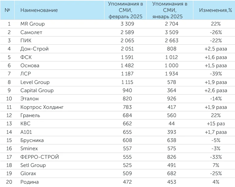 MR Group заняла первое место по количеству упоминаний в феврале 2025 года.