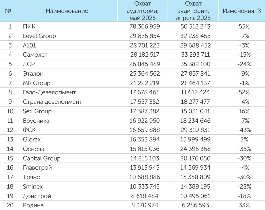 ГК «А101» заняла третье место по охвату аудитории в мае 2025 года.