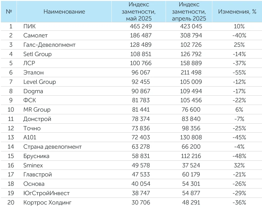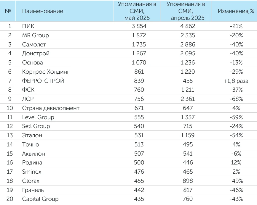 Система мониторинга и анализа СМИ и соцмедиа СКАН-Интерфакс совместно с онлайн-порталом «Строительной газеты» подготовили медиарейтинг девелоперских компаний за май 2025 года. В рейтингах девелоперов в мае 2025 году безусловным лидером, как и в апреле, осталась ГК ПИК, сохранил свое присутствие ГК «Самолет». Помимо данных компаний в топ-3 вошли MR Group, ГК «Галс-Девелопмент», Level Group и ГК «А101».
