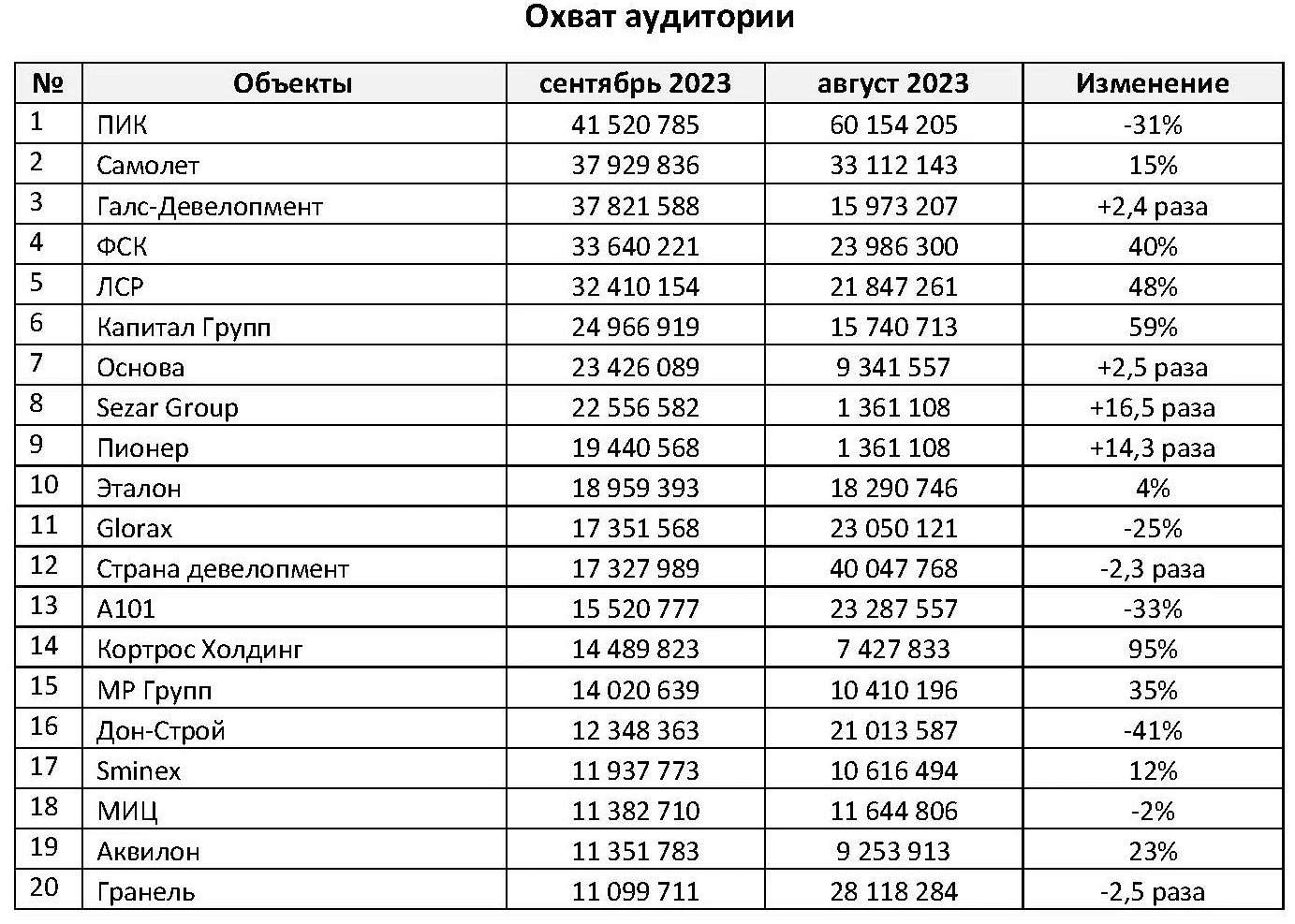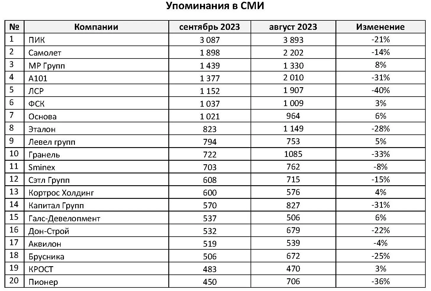 Система мониторинга и анализа СМИ и соцмедиа СКАН-Интерфакс совместно со «Строительной газетой» подготовили медиарейтинг компаний девелоперов за сентябрь 2023 года. В рейтингах девелоперов свое присутствие в топ-3 сохранили ГК «ПИК», ГК «Самолет», ГК «Галс-Девелопмент» и ГК «Эталон». Кроме данных компаний в топ-3 вошла также MR Group.