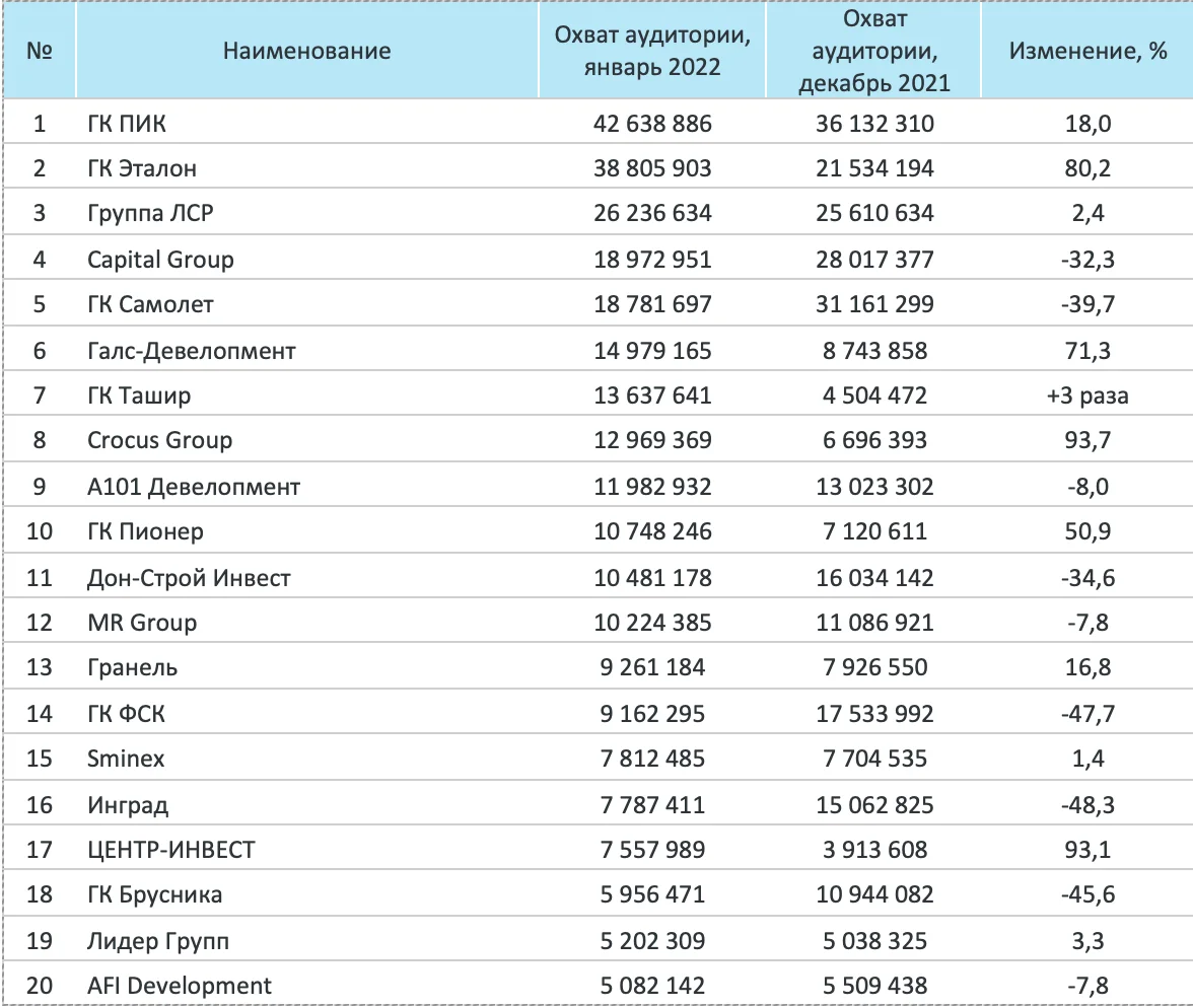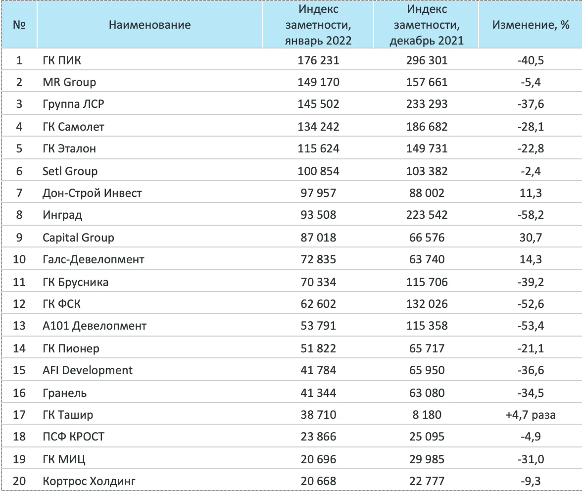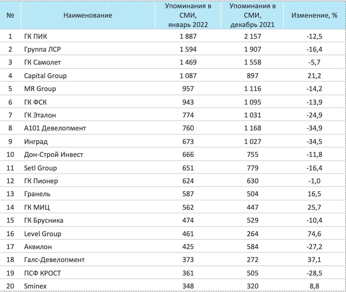 ГК «ПИК» в январе 2022 года занимает лидирующие позиции во всех трех медиарейтингах. Группа ЛСР занимает вторую строчку по количеству упоминаний и третью строчку по Индексу заметности компании в СМИ и охвату аудитории. ГК «Самолет» на третьем месте по количеству упоминаний. Девелопер MR Group занял второе место по «заметности» компании, застройщик «Эталон» расположился на втором месте по аудиторному охвату.