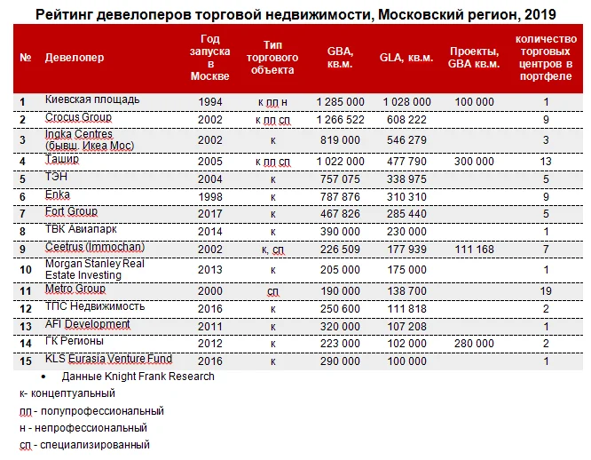 В тройке лидеров – «Киевская площадь» (ТРЦ «Европейский»), Crocus Group (сеть ТРЦ Vegas, «Твой дом» и т.д.) и Ingka Centres (сеть «МЕГА») – неизменные лидеры рейтинга за последние пять лет, хотя за этот период рейтинг пополнился 4 новыми игроками – ТВК «Авиапарк» (ТРЦ «Авиапарк»), «ТПС Недвижимость» (ТРЦ «Океания»), Fort Group (сеть «Золотые Вавилоны») и KLS Eurasia Venture Fund (ТРЦ «Ривьера»). По прогнозам специалистов Knight Frank, в перспективе 2-3 лет в рейтинге застройщиков торговой недвижимости ожидаются интересные изменения.