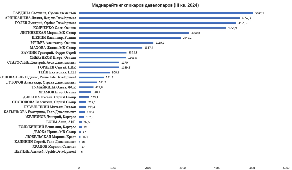 «Строительная газета» совместно с «Медиалогией» (система аналитики социальных медиа и СМИ, лидирующая на рынке по количеству источников) подготовила традиционный ежеквартальный медиарейтинг персон девелоперских компаний за III квартал 2024 года. Рейтинг составляется по МедиаИндексу, который измеряет прежде всего качество контента. Лидерами стали директор департамента продаж жилой недвижимости ГК «Сумма элементов» Светлана Бардина, коммерческий директор Regions Development Лилия Арцибашева, коммерческий директор Optima Development Дмитрий Голев.