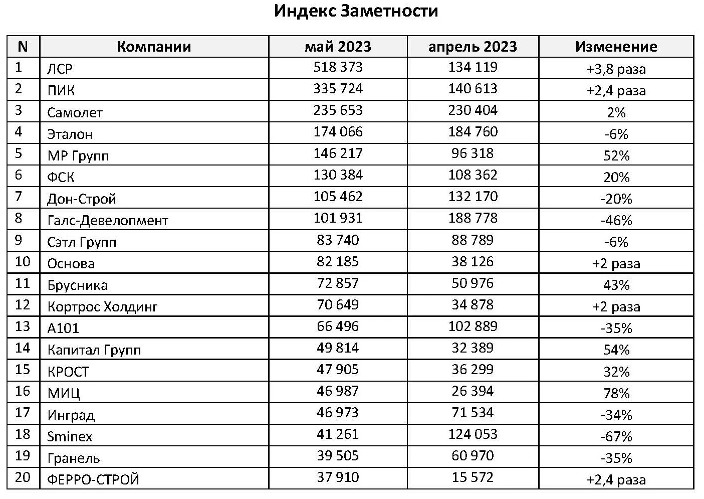 Группа компаний «ПИК» (первое место по количеству упоминаний и охвату аудитории, второе место по Индексу заметности) упоминалась в СМИ в связи с сообщением о пожаре на строительной площадке жилого комплекса «Новое Очаково». Застройщик сообщил, что пожар не затронул корпуса домов. Другой резонансной новостью стал отказ жителя подмосковного города Одинцово переселяться из выселенной пятиэтажки. Отвергнув 15, предложенных ему группой «ПИК», вариантов жилья, мужчина остался единственным жильцом предназначенного под снос дома. Администрация Одинцово и «ПИК» намерены выселить мужчину через суд. ПСБ и «ПИК» подписали соглашение о проектном финансировании комплексной застройки в Москве на Волоколамском шоссе. Сумма кредита составила 40,5 млрд руб. сроком на девять лет. Компания «ПИК», по данным на 1 мая, возводит 5,3 миллиона квадратных метров жилья, сохраняя первое место среди российских девелоперов по объему текущего жилищного строительства. Другие заметные новости в инфополе компании: Девелопер построит в Советском районе Владивостока квартал из семи домов высотой от 24 до 29 этажей с пешеходным бульваром; «ПИК» заключил с Москомстройинвестом договор о строительстве и передаче в собственность города Москвы двух детских садов и одной школы в районе Западное Дегунино и четырех образовательных объектов в Зеленограде.