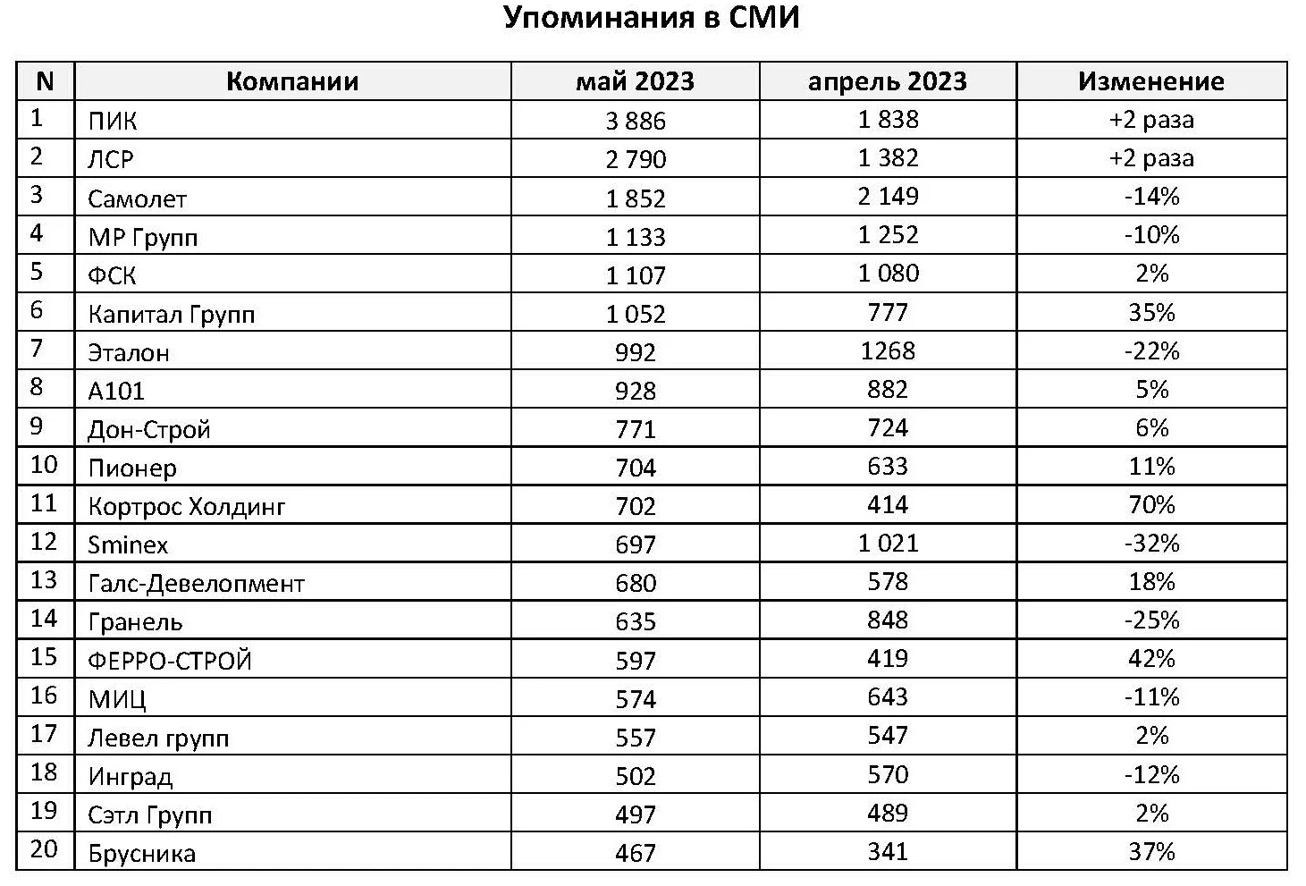 Система мониторинга и анализа СМИ и соцмедиа СКАН-Интерфакс совместно с онлайн-порталом «Строительной газеты» подготовили медиарейтинг девелоперов за май 2023 года. В топ-3 медиарейтинга свое присутствие сохранили ГК «ПИК», ГК «Самолет» и «Группа ЛСР».