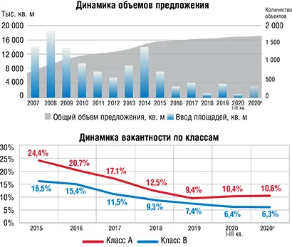 Однако ставки аренды офисов в классах А и В остались без существенных изменений — в целом по рынку собственники не готовы снижать расценки, но достичь компромисса в переговорах стало легче. Пока говорить о каком-то четком векторе динамики ставок сложно. Время для заметного падения цен еще не пришло, но уже сейчас понятно, что офисных переездов стало меньше. По большей части из-за снижения спроса на офисы класса А. Вакансия в них в 2020 году составила 10,4-10,8% (9,4% в 2019-м). Если тренд продолжится, то, по долгосрочным прогнозам, вакансия может дойти и до 13-15%.