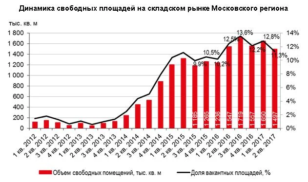 Согласно данным компании JLL, по итогам 2-го квартала 2017 года доля вакантных складских площадей в Московском регионе снизилась до 11,3% по сравнению с 12,8% в предыдущем квартале. В абсолютных цифрах показатель составляет 1,47 млн кв. м, что является самым низким значением за последний год.