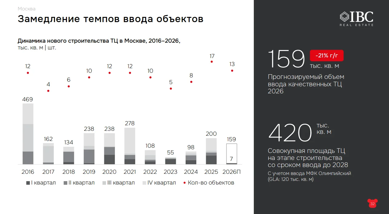 Среди основных тенденций в 2026 году руководитель направления торговой и гостиничной аналитики IBC Real Estate Валерия Шураева назвала снижение темпов ввода (теперь преимущественно будут открываться ТЦ районного формата) и оптимизацию торговых пространств: крупнейшие ретейлеры закрывают неприбыльные магазины, продолжая совершать лишь точечные открытия. «В условиях ускорения темпов жизни и усиления цифровизации ТЦ становятся местами проведения досуга. Собственники привлекают арендаторов, специализирующихся на развлечениях и общественном питании», — указала она.