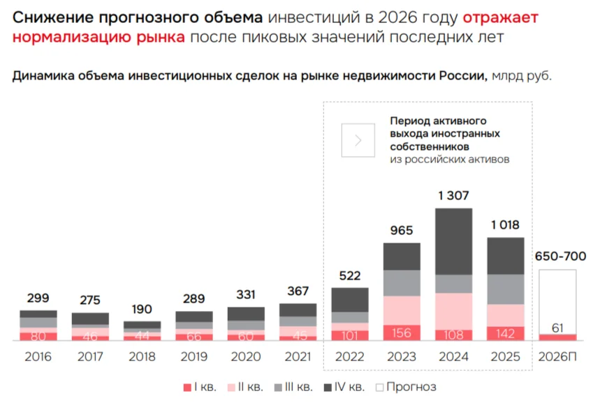 Среди основных тенденций 2026 года он назвал доминирование коммерческой недвижимости над жилой в структуре сделок, завершение фазы продаж активов иностранными компаниями, фокус инвесторов на качестве активов (сейчас приоритет отдается активам с устойчивым денежным потоком).