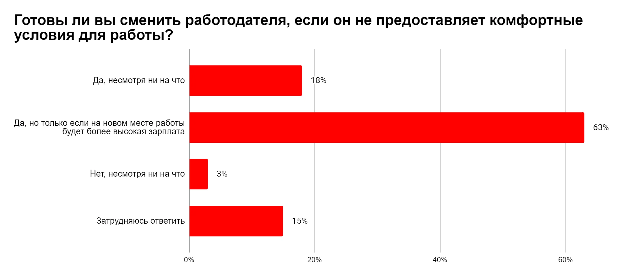 «Общее удобство и уют в офисе играют большую роль в удержании сотрудников. 18% готовы сменить работодателя несмотря ни на что, если он не предоставляет комфортные условия для работы. Еще 63% также готовы уйти из компании, которая не может обеспечить достойные условия труда, как только найдут место с более высокой заработной платой. Лишь 3% будут работать, невзирая на неудобство. Еще 15% затруднились ответить. Косвенно это подтверждают и данные о причинах отказа соискателей от предлагаемых им вакансий. Как показывает аналитика сервисов hh.ru, в 2023 году 8% несостоявшихся трудоустройств были связаны с тем, что соискателя не устроили условия работы, в том числе, непосредственное место работы - расположение и комфорт офиса», – указала Мария Игнатова.