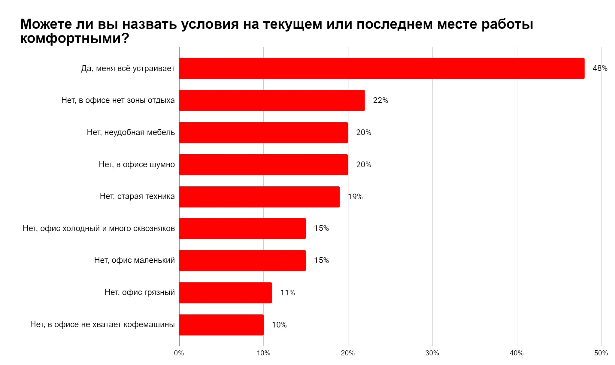 При этом по-настоящему комфортными свои условия работы называют только 48% опрошенных россиян, остальные так или иначе недовольны текущим офисом. Среди них 22% жалуются, что на работе нет зоны отдыха, по 20% – на неудобную мебель и шум, 19% – на старую технику. 15% россиян вынуждены работать в холодном офисе с постоянными сквозняками, еще столько же недовольны тем, что их офис слишком маленький. 11% рассказали, что у них на работе грязно, 10% – что нет кофемашины.