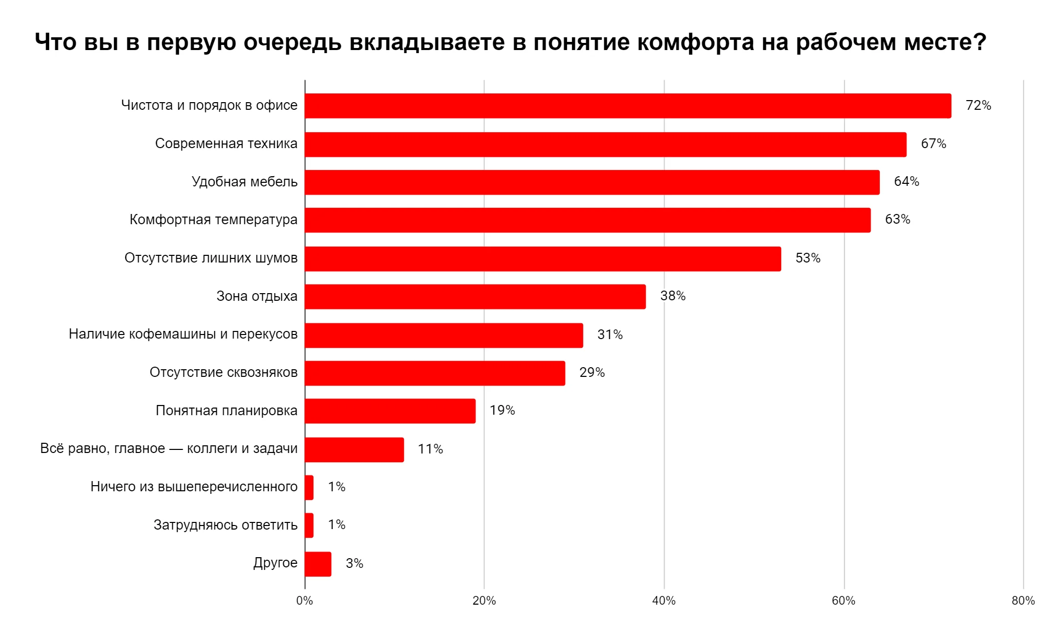 В понятие комфорта на рабочем месте большинство россиян вкладывают чистоту и порядок в офисе (72%), наличие современной техники (67%), удобную мебель (64%), комфортную температуру воздуха (63%) и отсутствие посторонних шумов (53%). Менее важны, но тоже имеют значение для плодотворной работы наличие зоны отдыха (38%), кофемашины и перекусов (31%), а также отсутствие сквозняков (29%) и понятная планировка (19%). И лишь 11% опрошенных признают – им абсолютно неважно, в каком состоянии находится офис, главное – хорошие коллеги и интересные задачи.