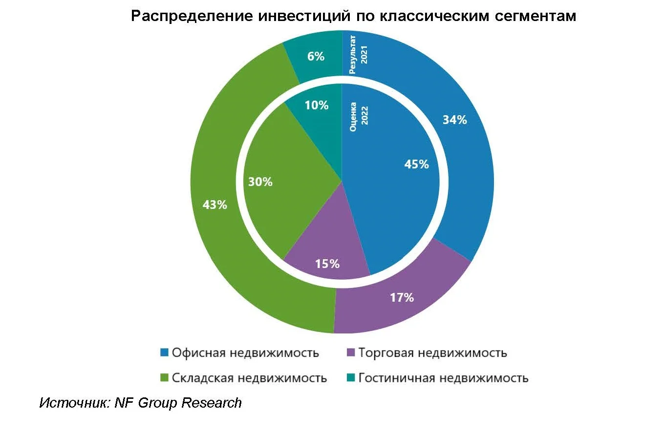 «Учитывая прогнозируемую долю площадок под девелопмент на уровне 45% от годового результата инвестирования, объем вложений в них по итогам года может составить до 130–140 млрд руб. Таким образом, на готовые объекты классических сегментов придется около 160-170 млрд руб., что на 20-30% больше, чем было зафиксировано в 2021 году. В структуре инвестиций в готовые объекты ожидается лидерство офисного сегмента, чья доля прогнозируется на уровне 45% против 34% годом ранее. Второе место в соответствии с ожиданиями займет складская недвижимость с долей в 30%», - уточнили в компании.