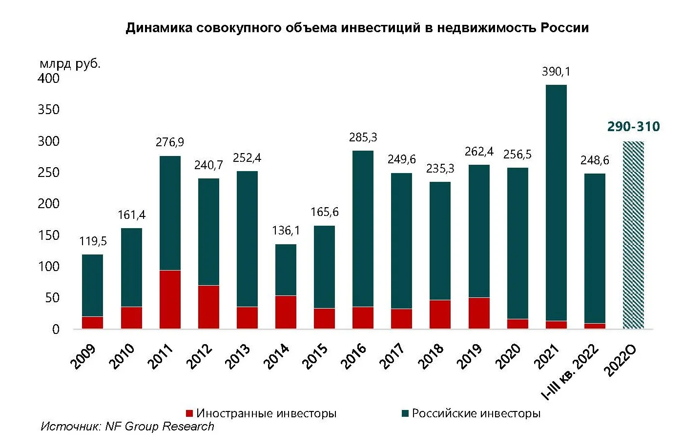 По предварительным итогам 2022 года совокупный объем инвестиций в недвижимость в России составит 290–310 млрд рублей, из которых на иностранный капитал придется менее 3%.