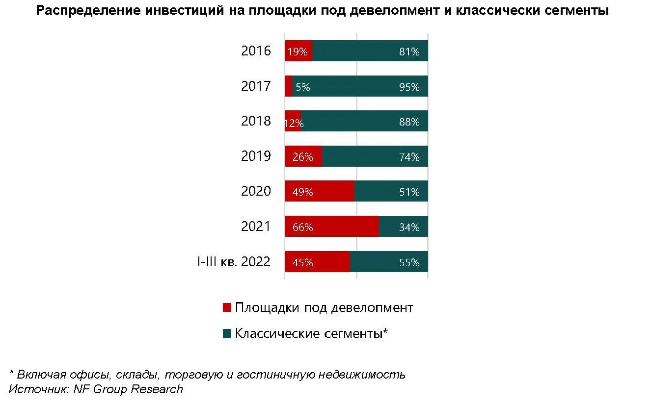 В 2022 году на рынке наблюдался рост инвестиций в классические сегменты коммерческой недвижимости – офисы, склады, торговые объекты, а также гостиницы. Если в 2021 году на них совокупно пришлось 34% объемов вложений, то за девять месяцев 2022 года показатель уже составил 55%. Об этом «Стройгазете» сообщили в пресс-службе компании международной консалтинговой компании NF Group (ex-Knight Frank Russia), аналитики которой подвели предварительные итоги года.