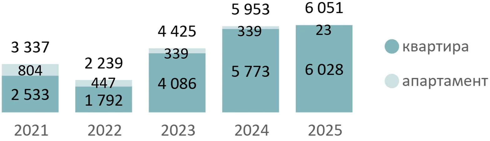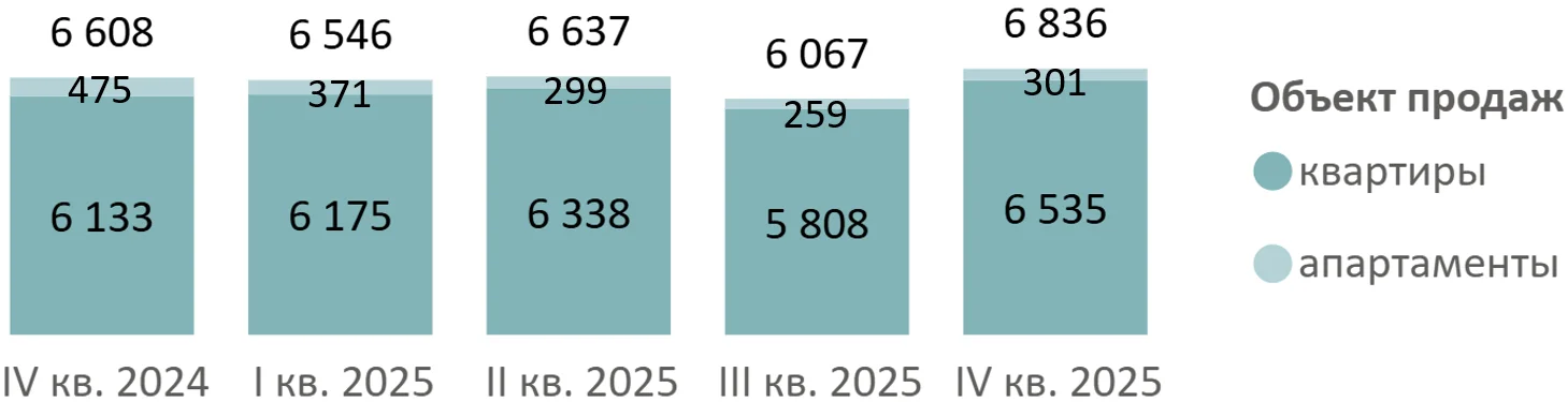 По итогам 2025 года на рынке новостроек премиум-класса была зарегистрирована 6 051 сделка ДДУ, что на 2% больше, чем в 2024 году. Минимальный спрос в 2025 году отмечен в II кв. (1 205 ДДУ за квартал). В IV квартале спрос вырос на 48% к предыдущему кварталу и составил 1 993 ДДУ, что на 16% больше, чем в IV квартале 2024 года.