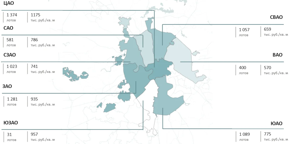 Структура предложения квартир и апартаментов премиум-класса г. Москвы по округам, количество лотов, средневзвешенная цена кв. м