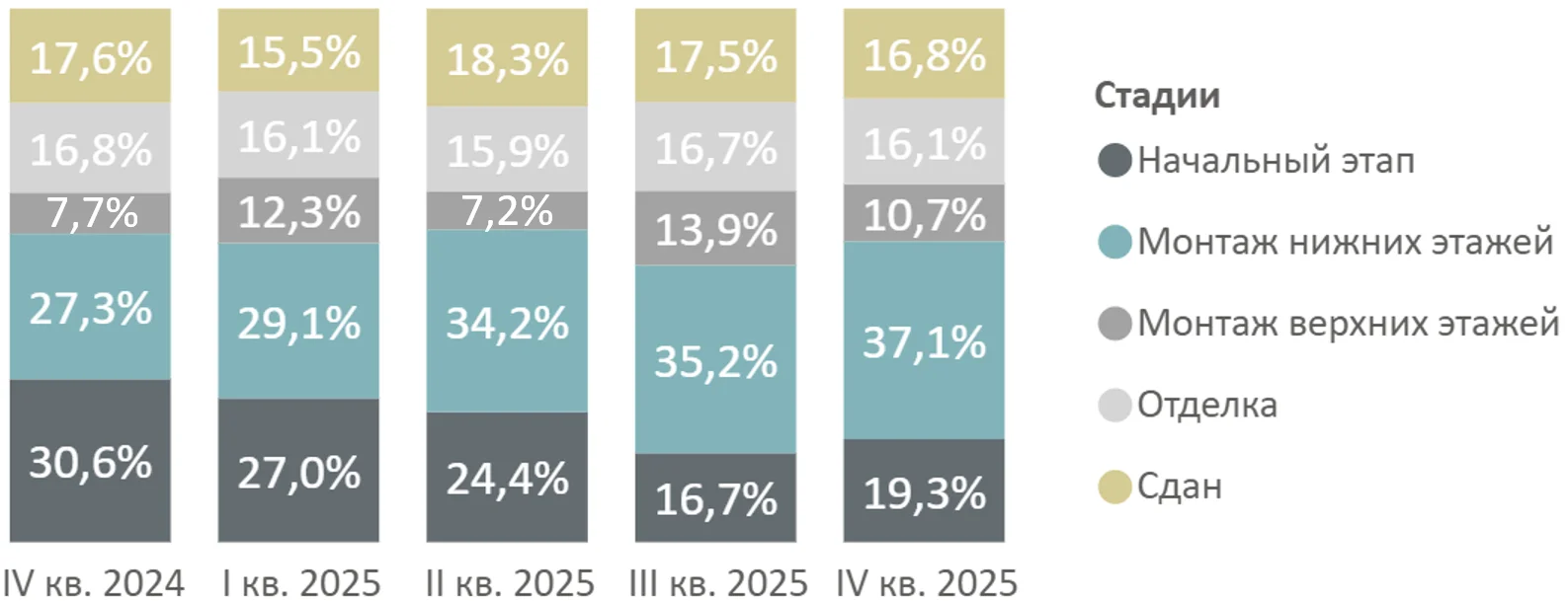 В структуре предложения по стадиям строительной готовности отмечается тенденция к сокращению доли предложения в корпусах на ранней стадии строительства (19,3%, -11,3 п.п. за год). Максимальный объем предложения сосредоточен в корпусах на этапе монтажа этажей (47,8%, +12,8 п.п.). Доли предложения в сданных корпусах (16,8%, -0,8 п.п.) и корпусах на этапе отделки (16,1%, -0,7 п.п.) незначительно изменились.