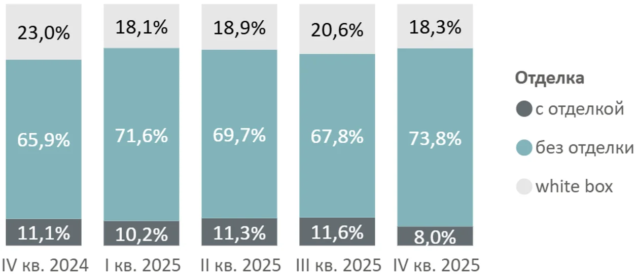 В распределении предложения по типу отделки отмечается рост доли предложения без отделки (73,8%, +7,9 п.п. за год) и сокращение доли предложения с чистовой отделкой (8,0%, -3,1 п.п.) и в формате white box (18,3%, -4,7 п.п.).