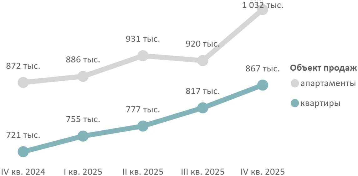 Если годом ранее в бюджете до 30 млн было сосредоточено 23% предложения, то за год доля таких предложений сократилась на 11 п.п. и составила 12%. По подсчетам аналитиков «Метриум», средневзвешенная цена квадратного метра квартир и апартаментов по итогам декабря 2025 года составила 874 940 рублей (+6% за квартал, +19% за год). Средневзвешенная цена метра в квартирах достигла 866 520 руб. рублей (+6% за квартал, +20% за год), в апартаментах – 1 031 690 рублей (+12% за квартал, +18% за год).