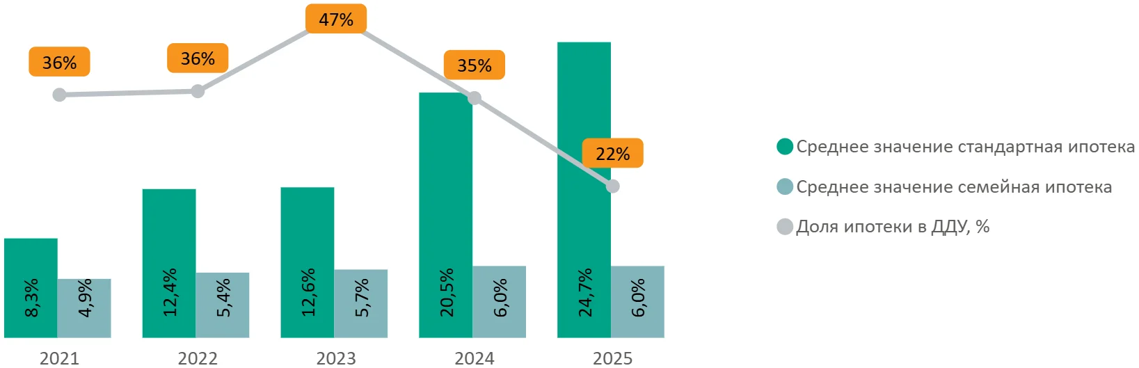 Несмотря на общее сокращение доли ипотеки за год на 13 п.п. (до 22%), в течение года наблюдался рост этого показателя с 15% до 28% к концу года. При этом в премиум-классе ипотека служит скорее дополнительным финансовым инструментом, а не ключевым фактором при принятии решения о покупке.