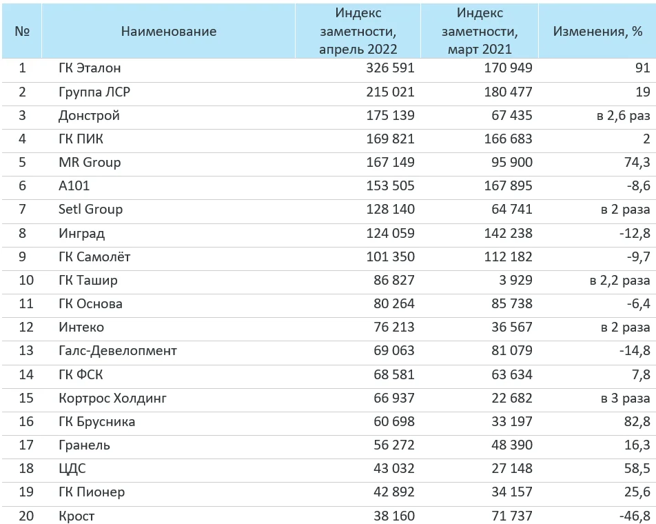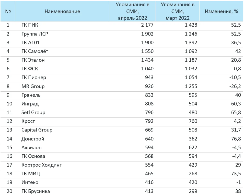 Группа компаний ПИК (первое место по количеству упоминаний) широко упоминалась в СМИ в связи с сообщением о том, что рейтинговое агентство Fitch отозвало рейтинг девелопера в рамках четвертого пакета санкций, принятого странами ЕС 15 марта 2022 года, в котором европейским агентствам запрещается рейтинговать РФ и российские компании, а также предоставлять рейтинговые услуги российским клиентам. На момент отзыва долгосрочный рейтинг дефолта эмитента (РДЭ) компании находился на уровне «CC». Активно освещалось в СМИ сообщение о том, что московские застройщики начали отказываться от отделки квартир из-за перебоев с поставками и подорожания материалов для производства мебели. В середине апреля ГК ПИК перестала реализовывать лоты с мебелью. Глава департамента развития новых территорий столицы Владимир Жидкин сообщил, что ряд застройщиков, в том числе ГК ПИК, приостановили реализацию проектов в Новой Москве, находящихся на «бумажной» стадии. Группа ПИК опровергла информацию о приостановке проектов. Другие новости в инфополе компании: власти Москвы одобрили застройку компанией ПИК части промзоны «Бутово» на Варшавском шоссе, где планируется возвести почти 800 тыс. кв. м. недвижимости; девелопер ввел в эксплуатацию корпус на 611 квартир в ЖК «Саларьево парк»; «Брусника» выкупила у группы ПИК часть проекта «Лосиноостровский парк» на востоке Москвы; ГК ПИК построит 5 корпусов ЖК «Матвеевский парк» на западе Москвы.