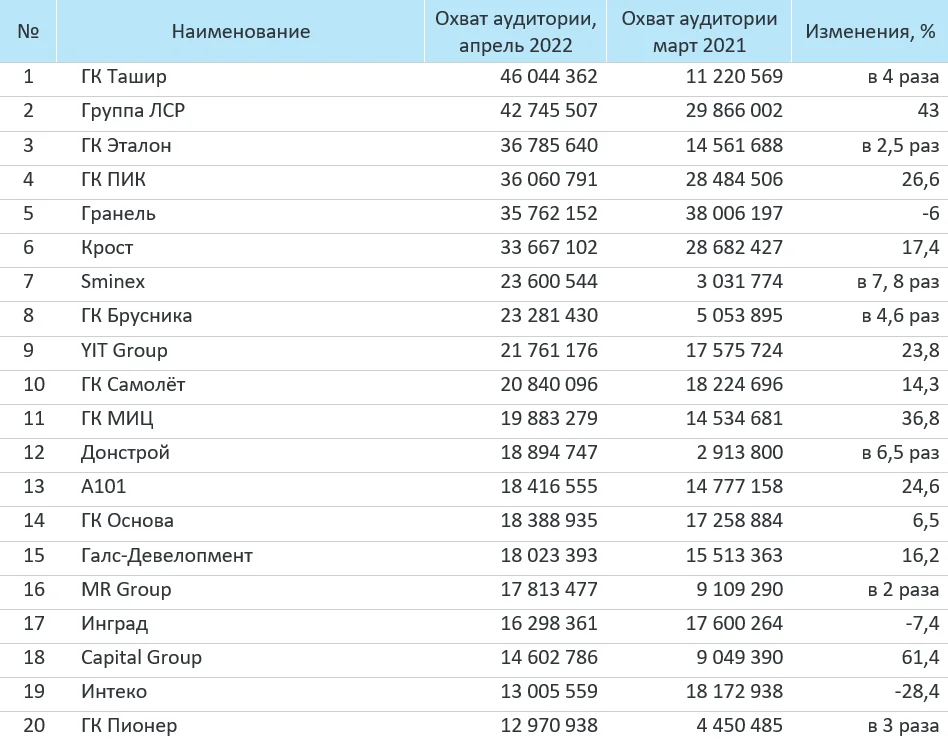 Стремительный рост показателя охвата аудитории девелопера Sminex (в 7,8 раз) связан с новостями о том, что московский булочно-кондитерский комбинат «Коломенский» купил российский бизнес финской компании Fazer (ООО «Хлебный Дом»), которая в марте объявила о прекращении работы в России. Комбинат «Коломенский» с 2007 года принадлежит Алексею Тулупову, владельцу девелоперской компании Sminex.