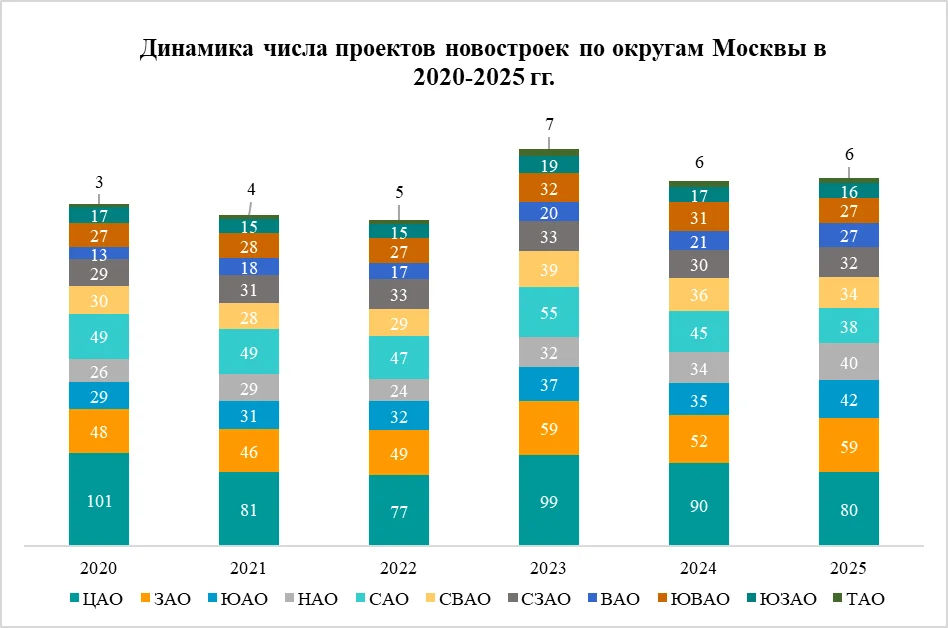 Восточный административный округ стал лидером по темпам роста новостроек. По подсчетам аналитиков «Метриум», количество новых проектов в этом округе увеличилось более чем вдвое: с 13 в I квартале 2020 года до 27 в I квартале 2025 года. Наиболее высокая динамика наблюдалась в Троицком административном округе (Новая Москва), где число проектов выросло с трех до шести, ровно в два раза. Остальные округа показали существенно меньший рост.