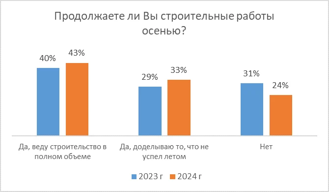 Для большинства респондентов осеннее строительство, по крайней мере в средней полосе России, уже давно обычное дело, так как преимуществ у такого строительства не меньше, чем в сезон. Так, 29% респондентов отметили, что с сентября-октября начинаются скидки на строительные материалы, а 19 % опрошенных сказали, что рабочие бригады в это время становятся доступнее, а прорабы сговорчивее в вопросах оплаты. Да и сам участок для строительства с нуля возможно приобрести по выгодной цене: это является существенным плюсом для 16% аудитории.