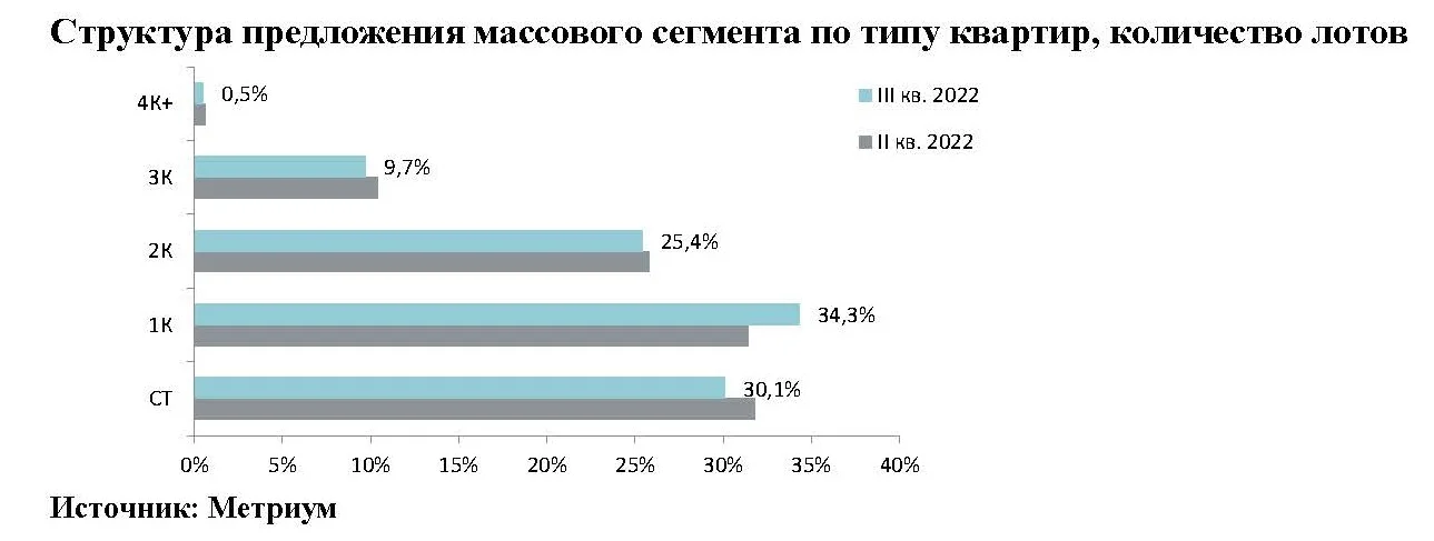 В разрезе типологий предложений массового сегмента произошли изменения. Студии, которые по объему стали превалировать в конце прошлого квартала вследствие пополнения рынка комплексами апартаментов, в текущем квартале уступили место однокомнатным предложениям – на них пришлась наибольшая часть предложений (34,3%, +1,5 п.п.).