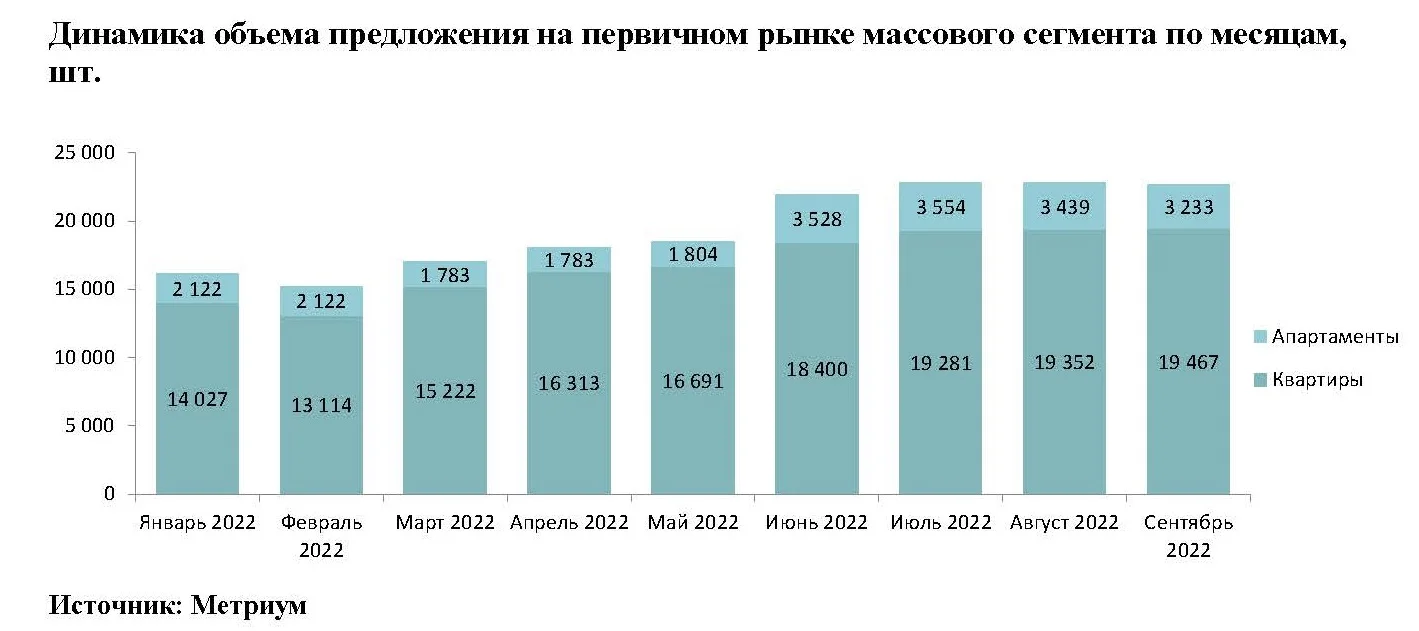 Спрос на массовые новостройки рос в течение всего квартала. В совокупности за три месяца было зарегистрировано 10,1 тыс. штук ДДУ. Это на 26% больше, чем во II квартале 2022 года, и на 18% больше, чем год назад – в III квартале 2021 года. Отмечается повышение интереса к апартаментам массового сегмента: количество сделок за квартал выросло на 43%. За последние полгода застройщики вывели в продажу рекордное количество апарт-комплексов эконом- и комфорт класса, что отвечает потребностям покупателей.