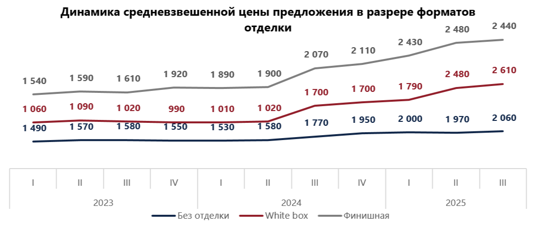 Аналитики отмечают устойчивый рост цен на все форматы отделки. Средневзвешенная цена квадратного метра составляет для лотов без отделки 2 060 тыс. рублей (рост на 16% за год), для white box – 2 610 тыс. рублей (плюс 53%), для финишной отделки – 2 440 тыс. рублей (плюс 18%).