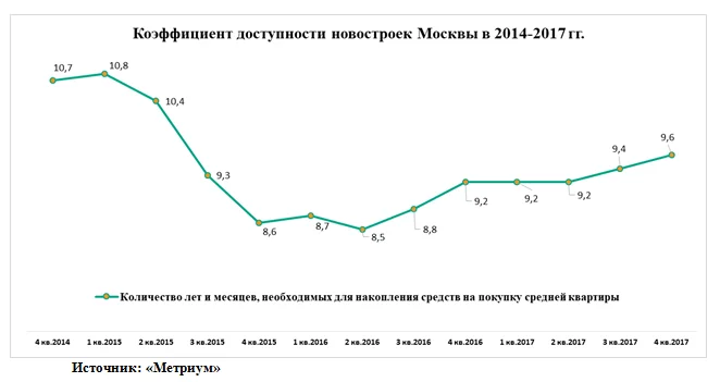 По сравнению с четвертым кварталом 2016 года доступность жилья снизилась. Год назад среднегодовой доход был таким же (906 тыс. рублей), но стоимость средней квартиры – ниже (8,36 млн рублей). Тогда московская семья могла накопить деньги за 9 лет и 2 месяца.