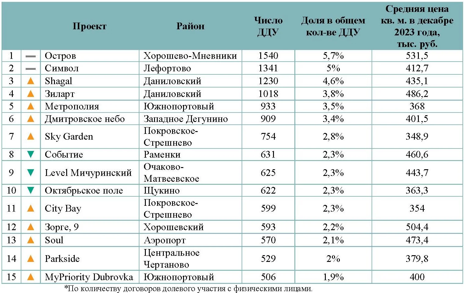 Лидером рейтинга пятый год подряд стал жилой комплекс «Остров» от компании «Донстрой». По итогам 2023 года в нем заключено 1540 договоров долевого участия (5,7% от всех ДДУ в бизнес-классе). Каждый месяц в «Острове» продавалось в среднем 128 квартир. Самым успешным периодом оказался октябрь, когда было реализовано 299 лотов. Средняя цена кв. метра в комплексе в декабре 2023 года составила 531,5 тыс. рублей.