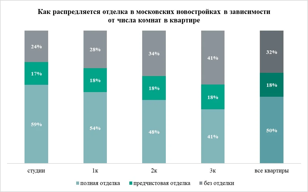 Впрочем, в разрезе отдельных сегментов картина не столь однозначная. В массовом сегменте московских новостроек чаще всего с отделкой (полная плюс предчистовая) предлагаются однокомнатные и двухкомнатные квартиры (по 91% от общего числа в продаже). Доля отделки в студиях составляет 87%. Однако по-прежнему трехкомнатные несколько отстают по представительству этой опции – 84% от общего числа квартир имеют отделку.