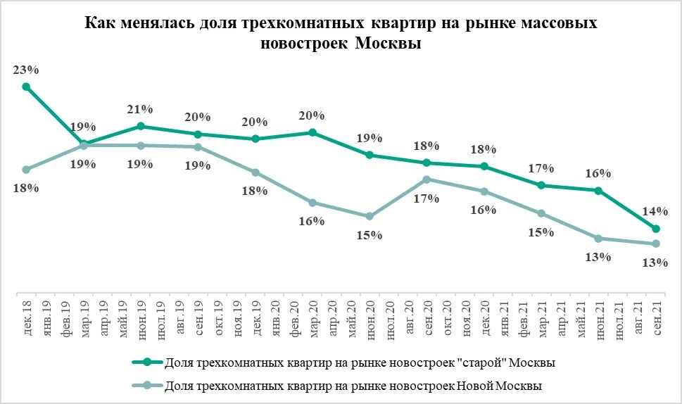 Похожая тенденция наблюдается и в Новой Москве. Здесь в сентябре застройщики продавали 9,8 тыс. квартир. Из них 1,3 тысячи – трехкомнатные. За прошедший квартал их число снизилось на 12%. Таким образом, сейчас на долю трехкомнатных квартир в Новой Москве приходятся 13% предложения жилья. Это все еще больше, чем у студий (11%), но меньше, чем у однокомнатных квартир (41%) и двухкомнатных (34%). Два года назад трехкомнатные квартиры составили 19% рынка, студии – 10%, однокомнатные квартиры – 30%, а двухкомнатные – 38%. Как и в «старой» Москве, в Новой Москве маленьких квартир становится больше, чем сравнительно больших.