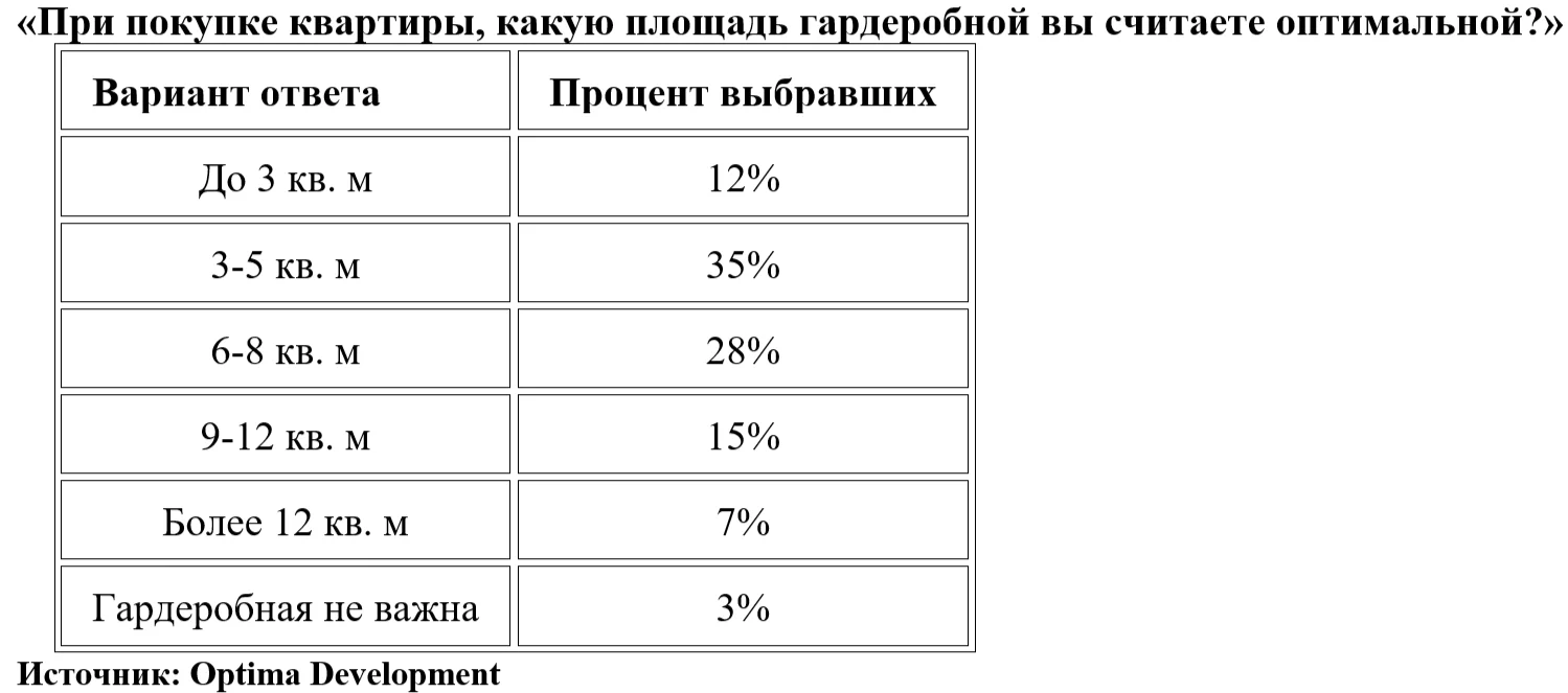 В преддверии 8 Марта компания Optima Development решила выяснить, какими гардеробными мечтают обзавестись московские женщины. Исследование проводилось в три этапа. Первый вопрос был открытым: женщин просили назвать дополнительное помещение в квартире, которого им больше всего не хватает для себя. Чаще всего женщины называли «гардеробная комната / хранилище для одежды и обуви». Среди других ответов фигурировали «комната для занятий йоги», «тренажерный зал», «студия для занятий танцами/пением/рисованием» и др.