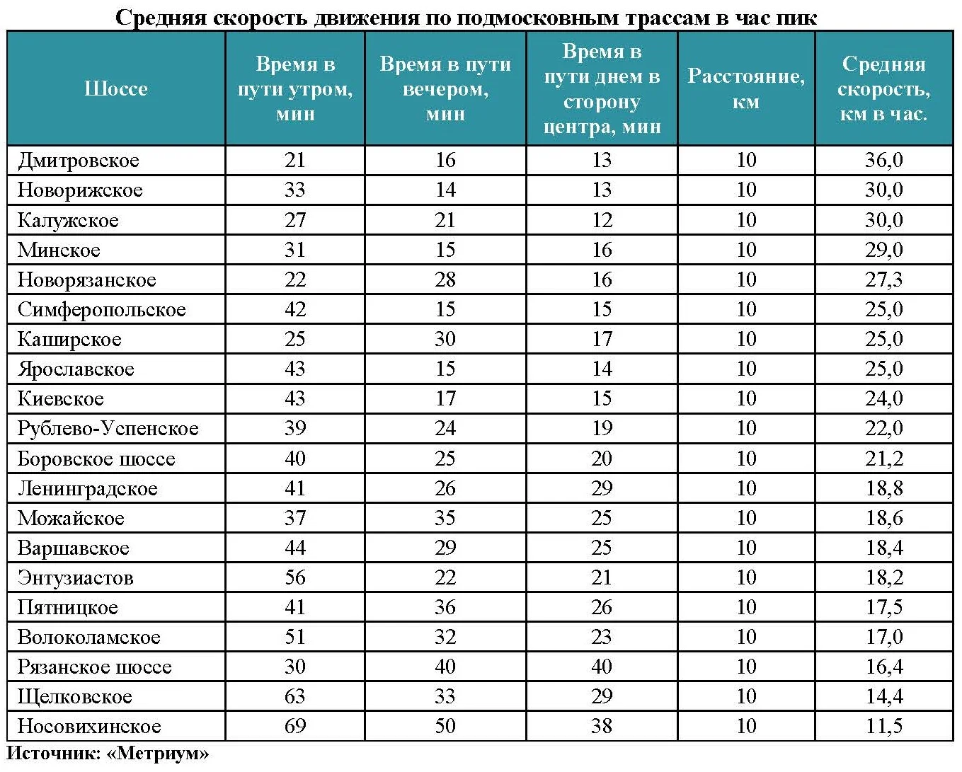 Лучший показатель скорости движения у Дмитровского шоссе. В среднем в час пик автомобилисты передвигаются здесь со скоростью 36 км в час. Время в пути утром в Москву по 10-километровому отрезку дороги составит 21 минуту, а вечером в обратном направлении – 16 минут.