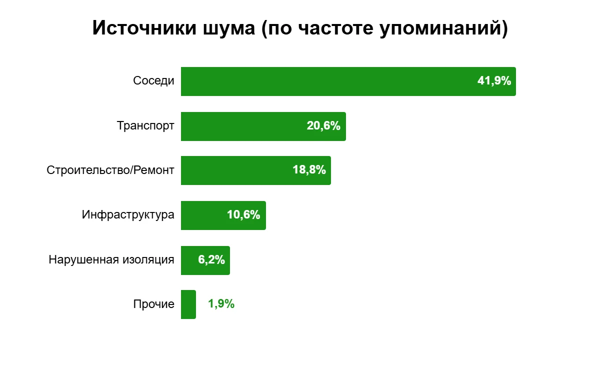 Мониторинг отзывов жителей крупнейших городов России показал, что чаще всего на шум жалуются москвичи: на столицу приходится сразу 74% от всех упоминаний о проблеме за последние четыре года. И что важно, речь идет не только о внешних источниках, вроде транспорта или стройки. Суммарно почти половина всех негативных откликов на акустическую среду связаны с соседями, тонкими перегородками или нарушенной изоляцией.