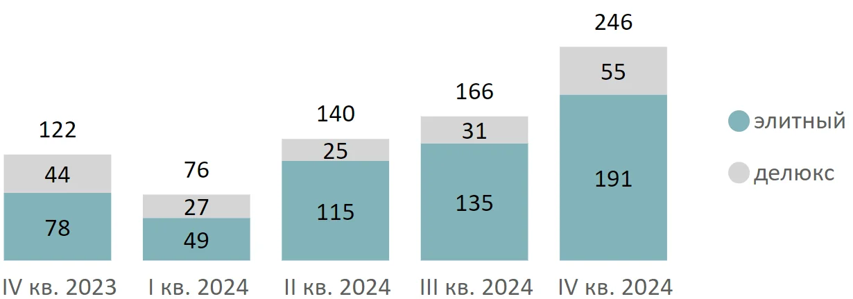 За 2024 год на первичном рынке высокобюджетной недвижимости было заключено 628 ДДУ, что на 87% больше, чем годом ранее. Самым результативным был IV квартал, когда было зарегистрировано 246 ДДУ. В 2024 году лидерами продаж по количеству сделок стали комплексы «Тишинский бульвар» (92 ДДУ), «Бадаевский» (91 ДДУ) и «Татарская 35» (58 ДДУ).
