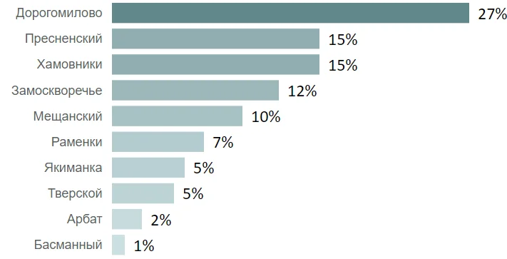 Наибольшее число сделок было отмечено в районе Дорогомилово (27%, +5 п.п. за год). Здесь реализуются такие масштабные проекты как «Бадаевский» и «Vesper Кутузовский».