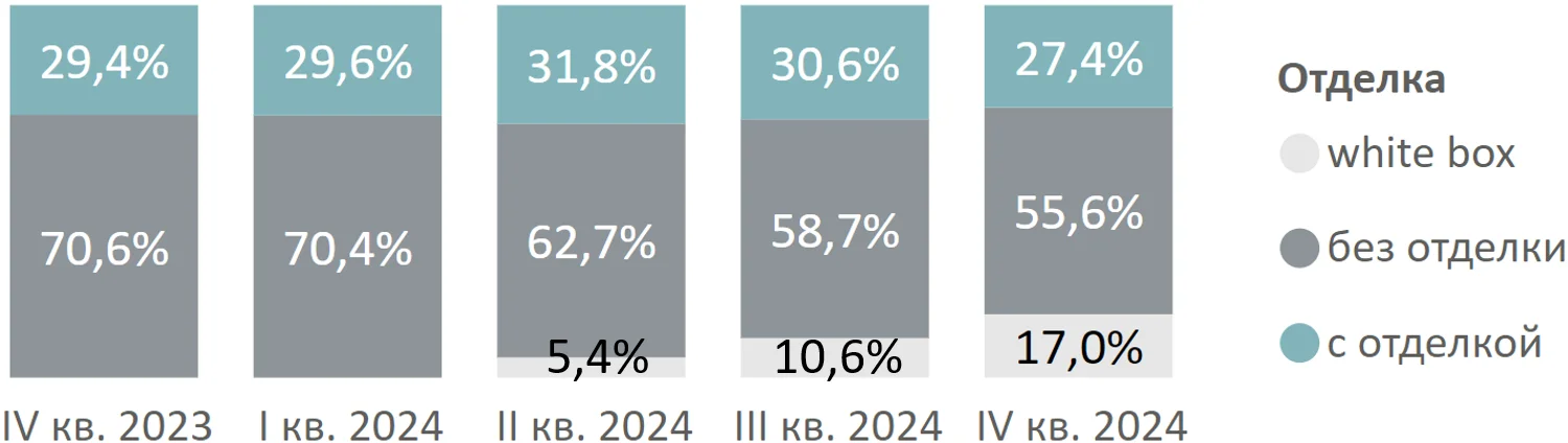 В элитных новостройках доля предложения с чистовой отделкой за год сократилась на 25,5 п.п. до 18,3%, а доля лотов без отделки выросла на 21,3 п. п. и достигла 66,3%. В новостройках делюкс-класса максимальная доля лотов предлагается без отделки (55,6%, -15 п.п. за год).