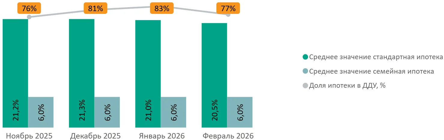 Доля сделок с привлечением ипотечного кредита за февраль сократилась на 6 п.п. и достигла 77%. Средняя ставка по стандартной ипотеке за месяц сократилась на 0,5 п.п., составив 20,5%.