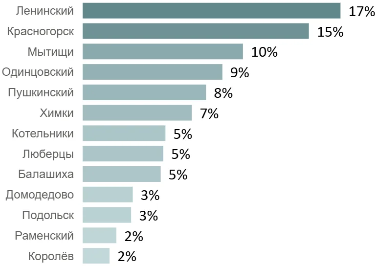 Распределение сделок по ДДУ на первичном рынке недвижимости Московской области по округам с максимальной долей спроса