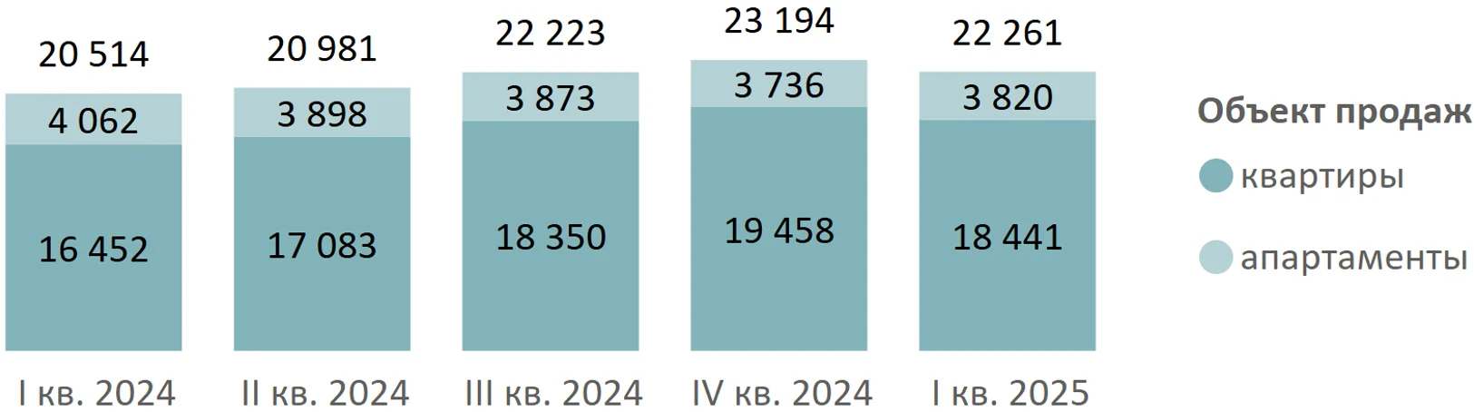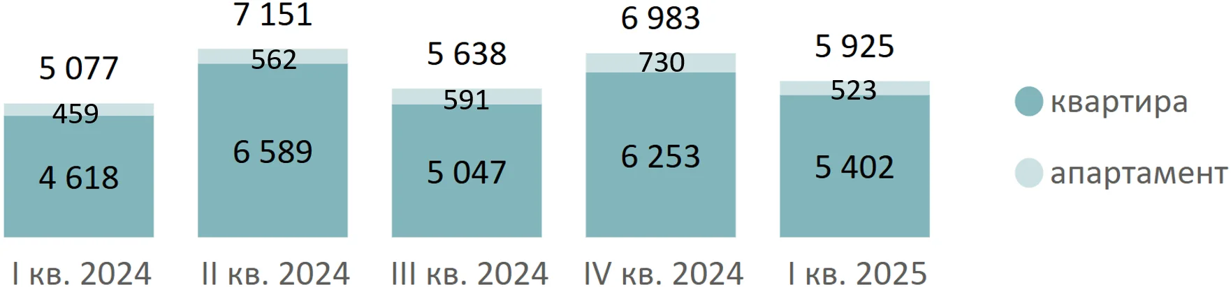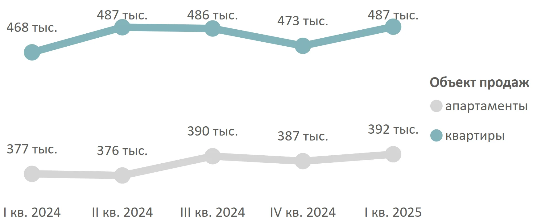 По подсчетам аналитиков «Метриум», средневзвешенная цена квадратного метра квартир и апартаментов по итогам I квартала 2025 года составила 473 300 руб. (+2,6% за квартал, +4,5% за год). Средневзвешенная цена квартир – 487 150 руб. за кв. м (+3,0% за квартал, +4,1% за год), апартаментов – 391 940 руб. за кв. м (+1,3% за квартал, +3,9% за год).